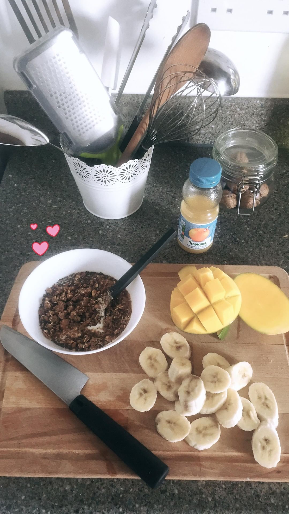 Blend, blend, blend!! Get a bowl and add 1/2 cup of chocolate granola and the other 1/2 of the banana.